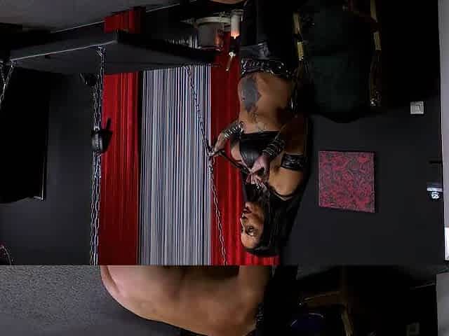 Sultry redhead dominatrix restrains and punishes the pale white man in BDSM chamber