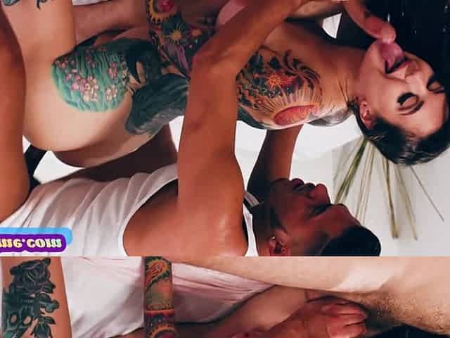 Busty bisexual tattooed babe gets MMF nailed after sucking
