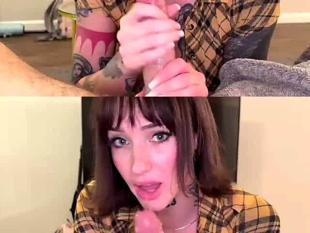 Big boobed MILF stepmom gives sensual handjob to son