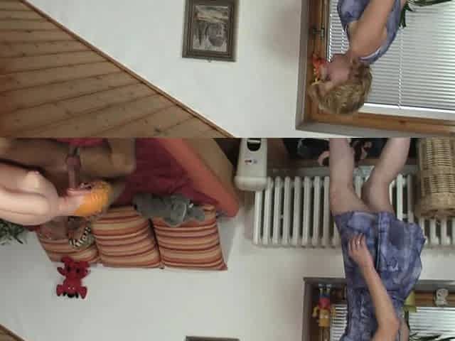 Mom toying his slim blonde girlfriend