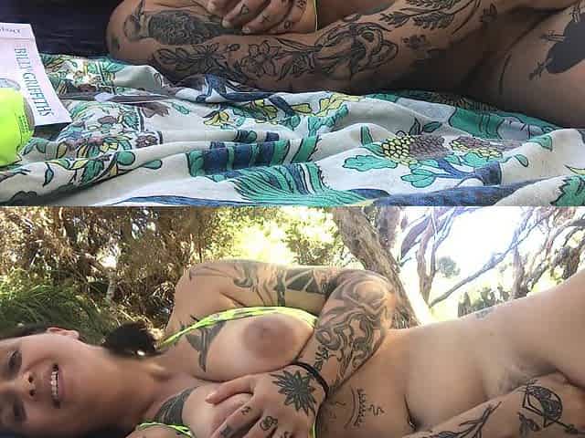 Wide showing off her large bazookas and shaven twat
