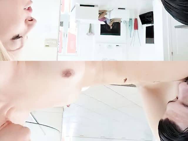 Charming light and dark haired cuties with natural titties eat pussies