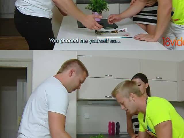 Brunette Hair had anal sex with a attractive plumber instead of giving cash for his services