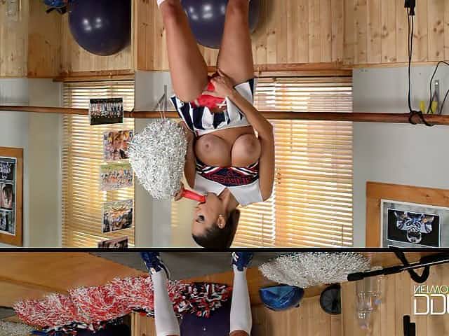 Mega busty cheerleader plays with boobs and pussy in front of a mirror