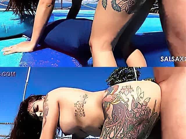 Tattooed Latina getting freaky by the pool