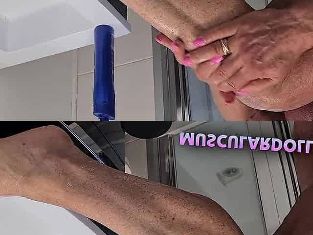 Professional Female Bodybuilder put cream on her undressed Muscle Body