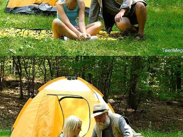 Old mushroom picker bumped into beautiful young blonde in the forest