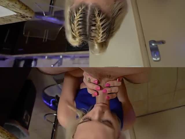Kinky blonde puts the guy's mushroom into mouth and passionately sucks