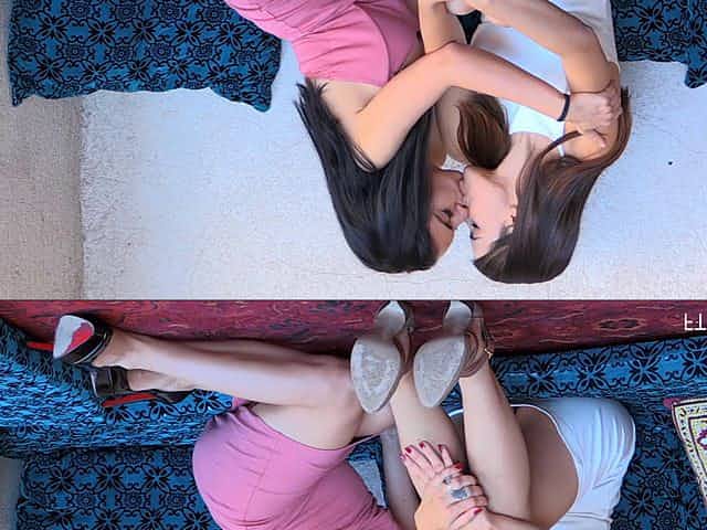 Two nude lesbian babes teasing and having fun with each other