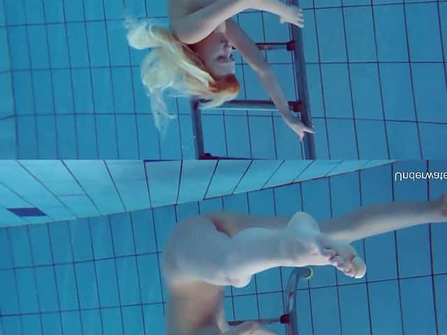 Desirable blonde chick Natalie Nice swims naked in the pool