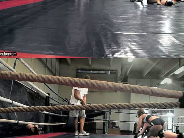 A couple of sexy sweeties have nude fighting on boxing ring