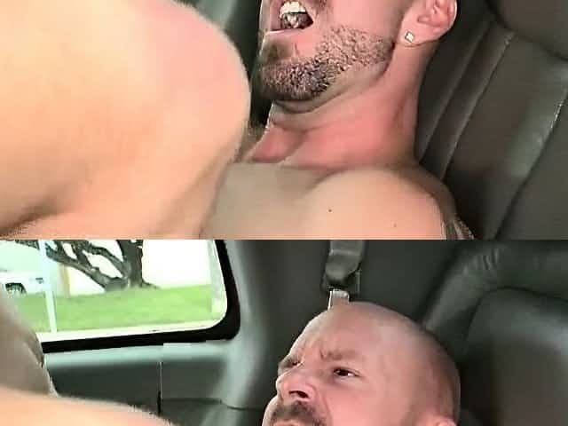 Naked hairy dude eats two cock