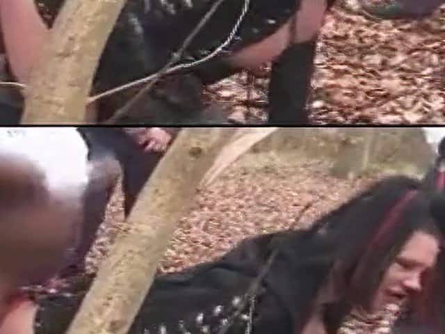 Man fucks outside on tree