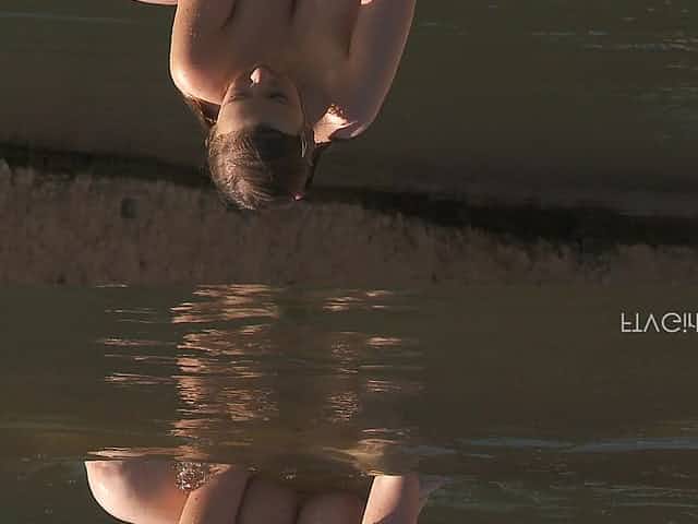 Nature loving brunette babe gets naked in a pond and masturbates