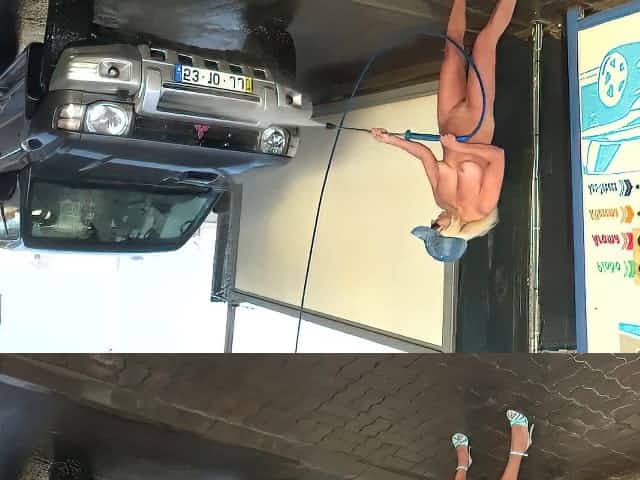 Naked blonde washed jeep at a public car wash