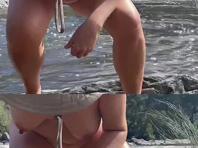 Risky outdoor footplay by a nude wife at the river