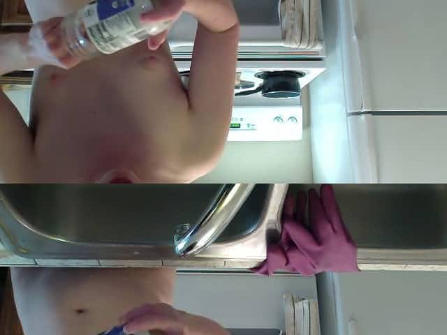 A friend Shoots how a Naked beauty cleans up in his kitchen.