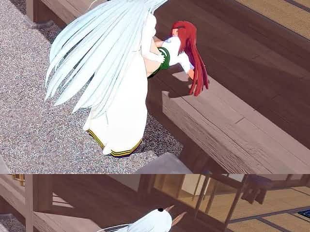3D hentai, cosplay girl with fox ears makes a deep blowjob to a guy from anime