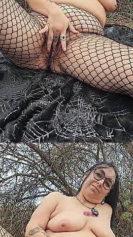 Alt angel in fishnets fingers herself in the woods