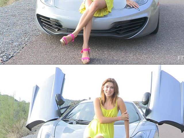 Naughty solo girl poses on a McLaren naked in pink high heels