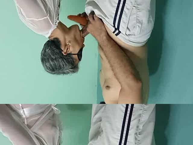 Naughty cougar pleases her husband with an intense blowjob and receives a messy cumshot.