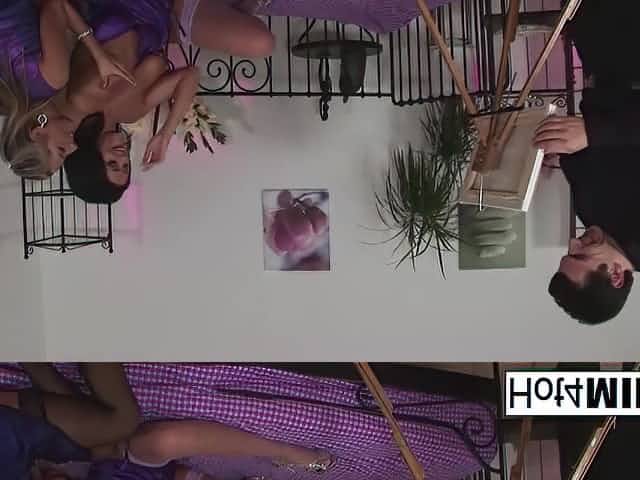 Daria and Christina are sharing a rock hard spear while having a threeway with their neighbor