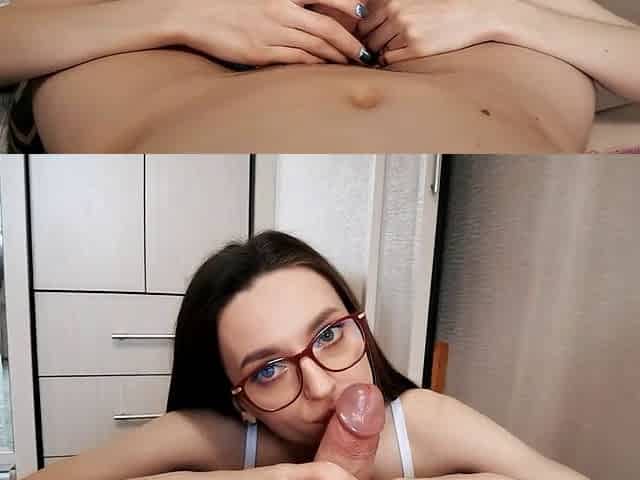 Nerdy glasses-wearing teenage babe gives a homemade blowjob that's pure sweetness