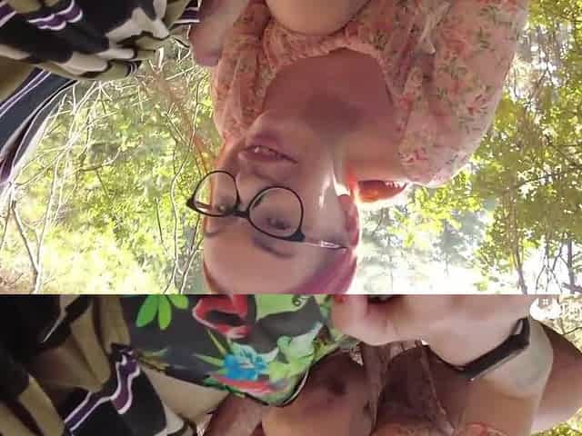 Nerdy hottie with pink hair and glasses is sucking shlong and getting screwed in the nature
