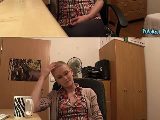 Nerdy teen is busted by her boss as she sucks on a huge cock