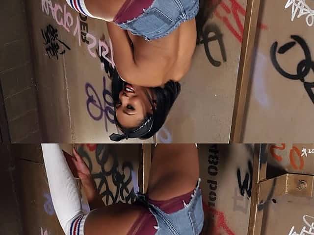 Skinny Alexis Tae in miniskirt drops on her knees to suck a dick