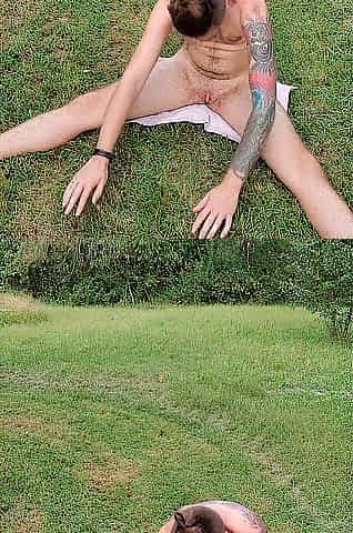 Ftm stretches and plays with vagina in open field