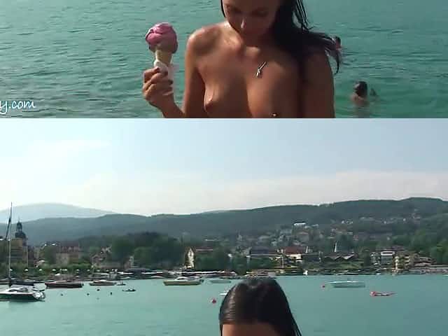 Super skinny blonde Italian babe Francy Torino stripping at a pier outdoor