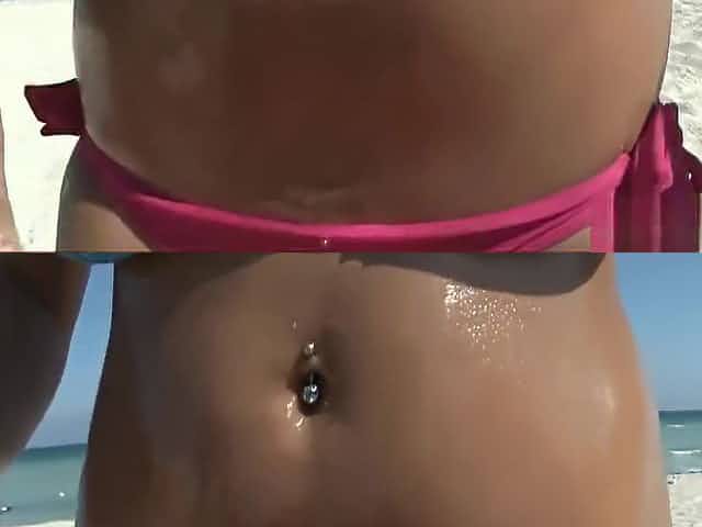 Nude chick with pierced nipples and small bush at beach