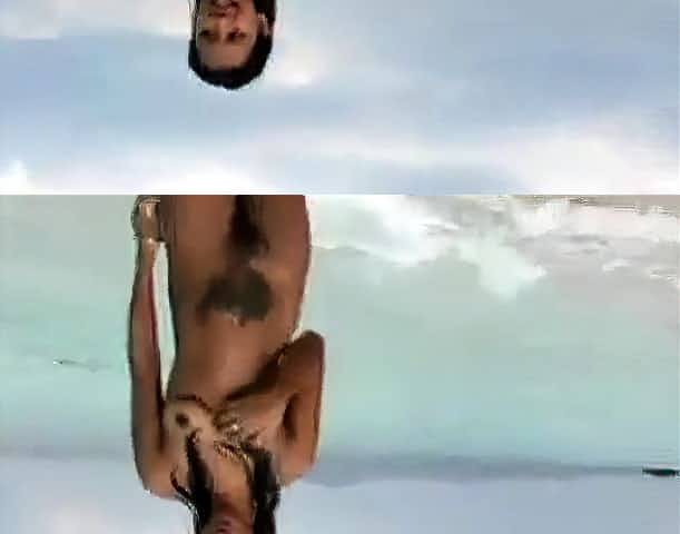 Hot brunette sex bomb does naked yoga on a gorgeous beach