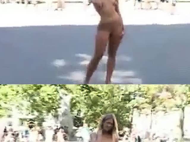 Blonde milf working out naked on the beach
