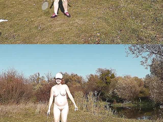 Outdoors wild beach. nude milf learns to play badminton together