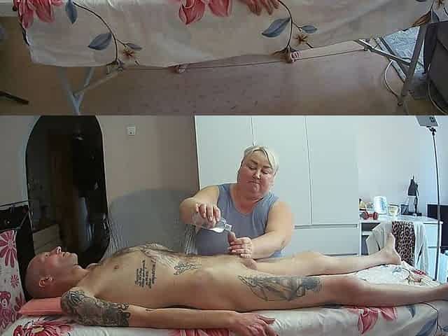 naked massage from hot blonde who pours oil over her body and grinds on her