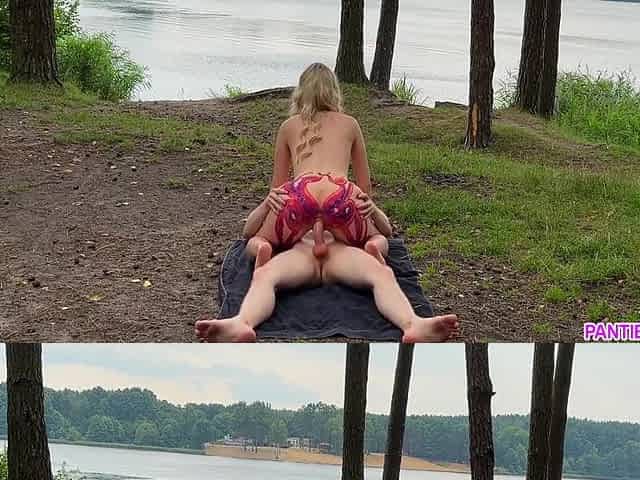 Blonde Roughly Rides Big Cock Outdoors In Forest Until Gets Huge Cumshot Load On Boobs