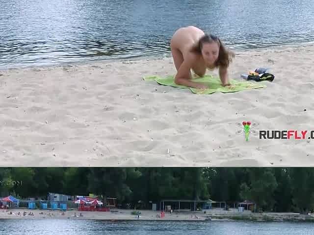 Bitch on the beach wetting her horny nudist pussy