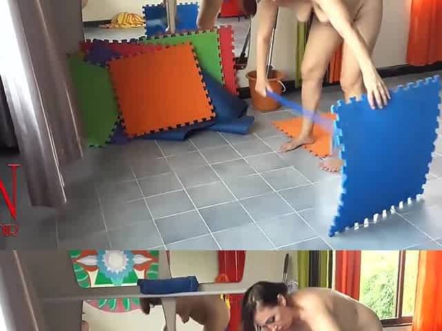 Nudist Maid Cleans The Yoga Room. A Naked Cleaner Cleans Mirrors Sweeps And Mops The Floor. S2