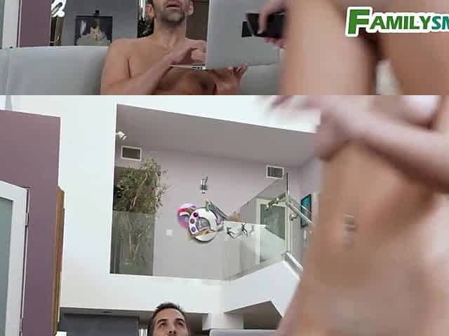 Completely Naked While Her Stepson Masturbates Watching Her