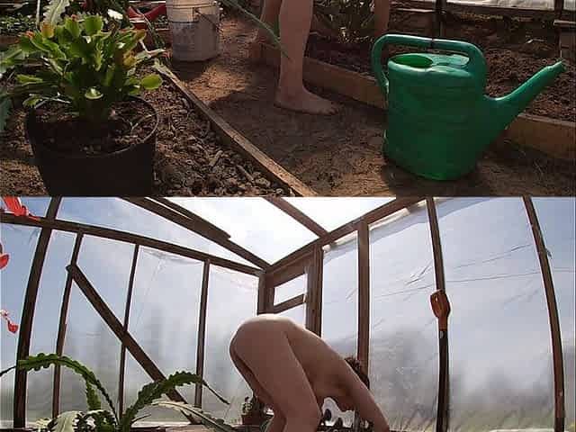 Naked Greenhouse Worker Planting Cacti