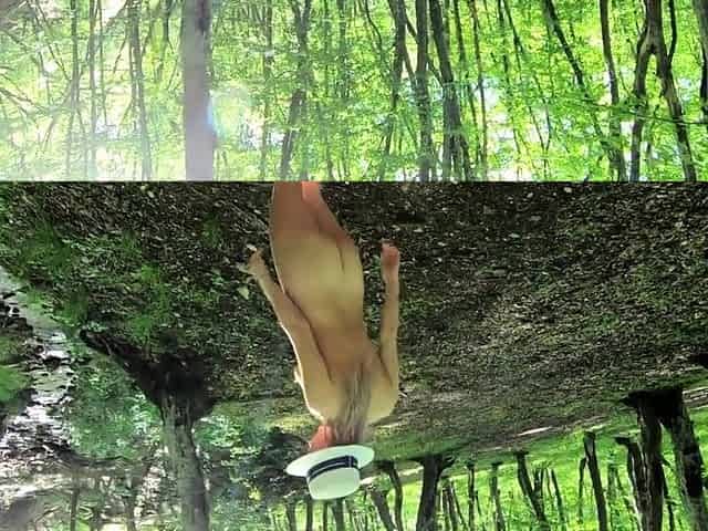 Nudist girl walks in the woods