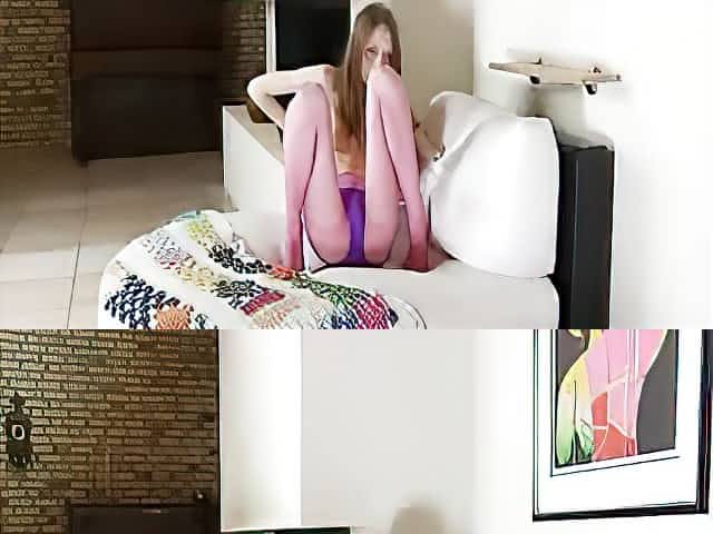 Drunk girl in purple nylon pantyhose