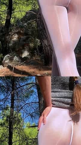 White oil shiny pantyhose in mountain forest