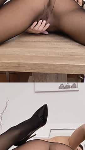 POV. Trying on nylon tights and high heels.