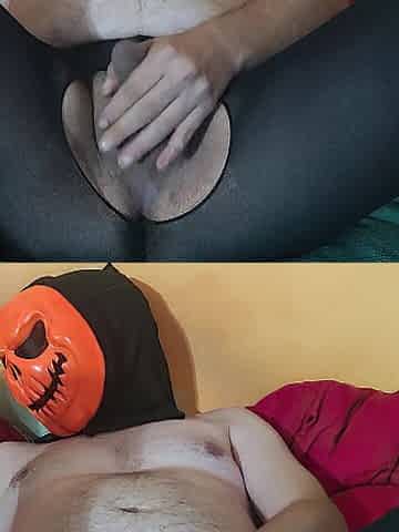 Chap in Halloween mask and nylon tights gratifying himself...