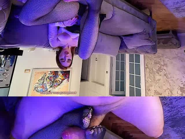 Footjob in black tights and wetlook, then came the load