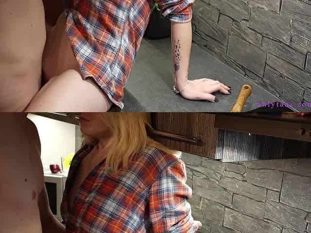 Teen gets many screaming orgasms and deep creampie while trying to get pregnant in kitchen