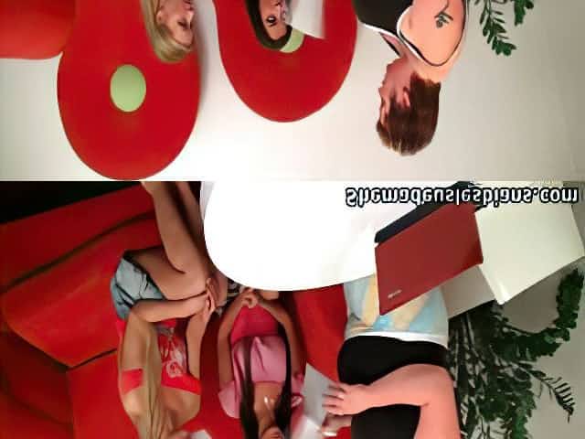 Tanned blondie and horny brunette masturbate in front of mature slut